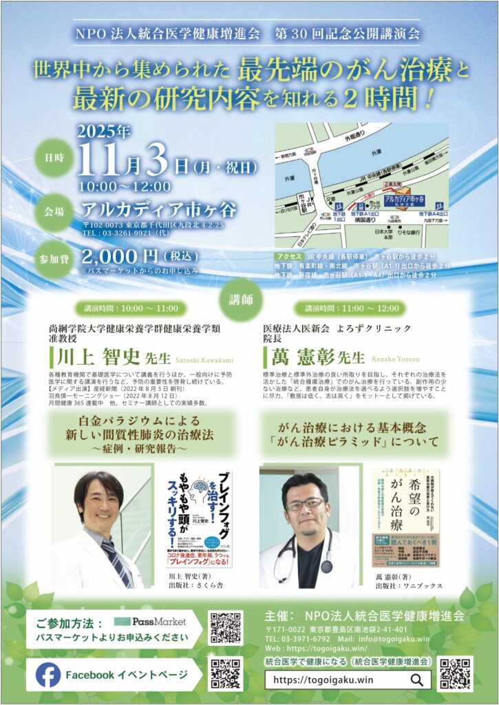 NPO法人 統合医学健康増進会 第30回記念公開講演会『最先端のがん治療と最新の研究内容』